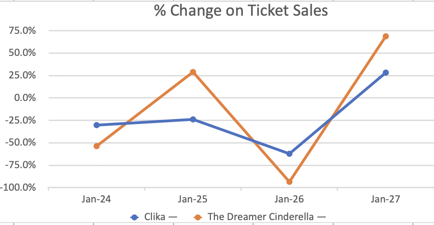 Trying to evaluate each film’s marketing effectiveness by comparing their total box office gross ticket sales would be unfair. Between January 23 and January 27, Clika earned $1,520,455 while The Dreamer Cinderella earned $8,880—a differential that reflects their vastly different scales of distribution. Instead, it is more equitable to compare the percentage changes in daily gross ticket sales respective to each film. This approach highlights momentum rather than reach, an especially useful lens for independent films whose full box office data is often underreported. While these limitations make a fully precise picture difficult, the figures still offer a meaningful basis for interpretation.